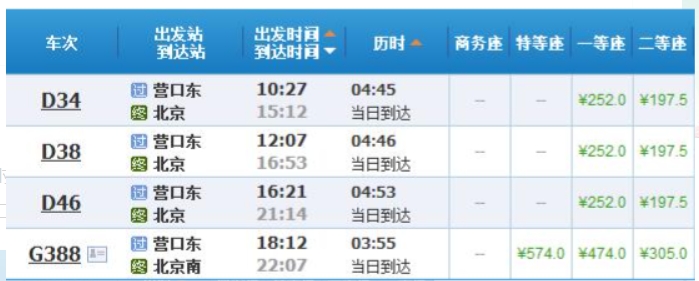 遼寧營(yíng)口到北京每天4趟車(chē),首末班時(shí)間為10點(diǎn)27分和18點(diǎn)12分,耗時(shí)3小時(shí)55分鐘到4小時(shí)53分鐘,動(dòng)車(chē)二等座票價(jià)197.5元,高鐵二等座票價(jià)305元。